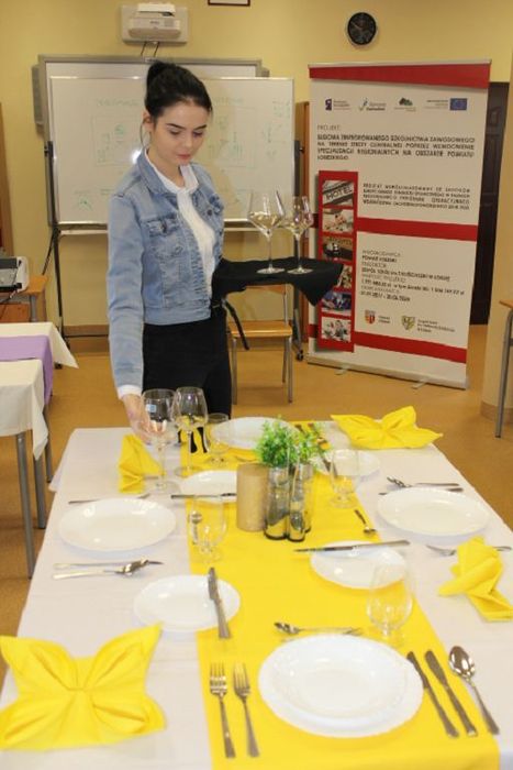 10 uczennic, kształcących się w zawodzie technik hotelarstwa zdobywało dodatkową wiedzę i doskonaliło umiejętności zawodowe. Uczestnicy po części teoretycznej, obejmującej m.in. zagadnienia dotyczące kultury osobistej kelnera i etyki zawodowej, ćwiczyli techniki składania obrusów i serwetek, noszenia talerzy i serwowania potraw. Poznali także różne rodzaje serwisów oraz opanowali podstawy wiedzy sommelierskiej, czyli podawania win.