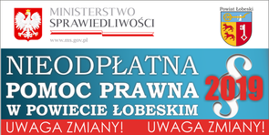 Od 1 stycznia 2019 r. na terenie Powiatu Łobeskiego ponownie ruszy Nieodpłatna Pomoc Prawna Informujemy, że z dniem 2 stycznia 2019 r. na terenie Powiatu Łobeskiego ponownie uruchomione zostaną punkty nieodpłatnej pomocy prawnej. Nieodpłatnej pomocy prawnej udzielają osobiście adwokaci lub radcowie prawni (w uzasadnionych przypadkach aplikanci adwokaccy lub aplikanci radcowscy), a także osoby współpracujące z organizacją pozarządową. Od 1 stycznia 2019 r. czyli od dnia wejścia w życie ustawy nowelizującej z bezpłatnej pomocy prawnej będzie mogła skorzystać osoba uprawniona, „która nie jest w stanie ponieść kosztów odpłatnej pomocy...