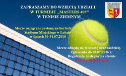 Regulamin Turnieju Masters 40+w Tenisie ZiemnymŁobez 30-31.07.2016 r. zgłoszenia do 28.07.2016 r. 1. Zapisy do turnieju: pocztą elektroniczną na adres zblawzdziewicz@wp.pl (lub telefonicznie 517 394 403 – Zygmunt Bławzdziewicz) do 28.07.2016 r. z podaniem roku urodzenia, miejscowości zamieszkania i numeru telefonu. 2. Mecze rozgrywane zostaną na kortach w Łobzie – planowany termin 30 - 31.07.2016 r. (sobota i niedziela). 3. Uczestnikiem turnieju może być każda osoba, która na dzień 30.07 ukończyła 40 lat. Uczestnik zapisując się do udziału w turnieju wyraża tym samym zgodę na umieszczenie swojego nazwiska i imienia (oraz ewentualnych...