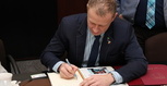Na spotkaniu Paweł Marek Starosta Łobeski wpisał się do księgi pamiątkowej oraz przekazał zestawy promocyjne naszego powiatu.