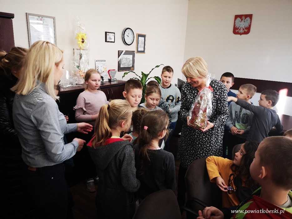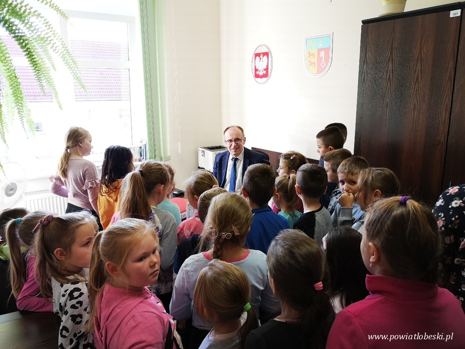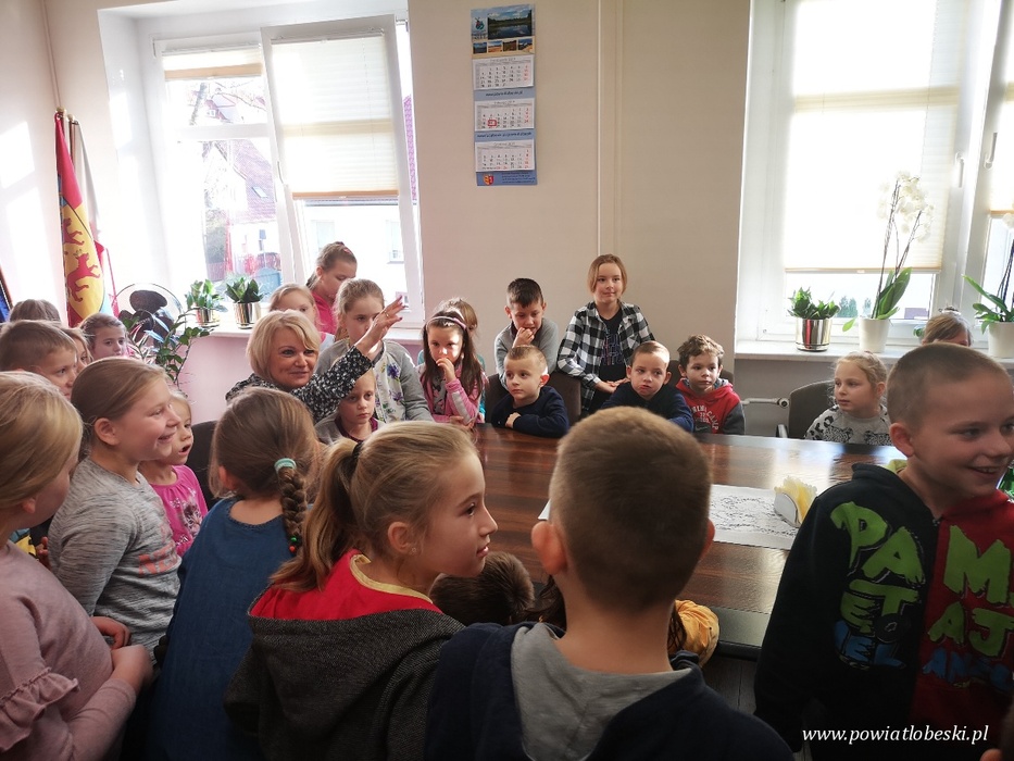 W dniu 19 listopada 2019 r. mieliśmy przyjemność gościć w naszych murach uczniów pierwszej, drugiej i trzeciej klasy szkoły podstawowej w Starogardzie z gminy Resko. Podczas wizyty dzieci zadawały wiele ciekawych pytań, jednym które najczęściej się pojawiało, oprócz szukania sejfu, było jakie szkoły należy ukończyć, aby móc pracować w urzędzie. Poszukiwanie odpowiedzi dla naszych gości było wspaniałą podróżą po świecie dorosłych. Oprócz podstawowej wiedzy dotyczącej funkcjonowania starostwa i podległych jednostek, wszyscy z wielkim zainteresowaniem słuchali opowieści o obiegu pieniędzy - jak się okazało wszystkie znajdują się w banku na kontach, zatem na próżno trwały poszukiwania ukrytego sejfu za obrazem u skarbnika. Wycieczki nie było końca, wspólnie zastanawialiśmy się, jak zdobyć prawo jazdy, jakie pojazdy należy rejestrować, gdzie szukać pomocy jak spotkamy na swojej drodze łobuza. Naszym gościom zdradziliśmy również kilka sekretów np. istnieje tajemniczy przycisk, dzięki któremu Pani Starosta może szybko dać znać,że potrzebuje pomocy lub kiedy oczekujący gość może udać się do jej gabinetu na spotkanie. Udało nam się także porozmawiać z Panem Adwokatem, który opowiedział o swojej trudnej pracy, a także o tym jak może pomóc innym mieszkańcom naszego powiatu pełniąc dyżur w ramach Punktu Nieodpłatnej Pomocy Prawnej. Najważniejszym punktem wizyty było spotkanie z Renatą Kulik Starostą Łobeskim oraz Krzysztofem Gwoździem Wicestarostą jak i Andrzejem Gradusem Członkiem Zarządu Powiatu w Łobzie, dzieciaki z wielką ochotą rozmawiały i odpowiadały na pytania, a co najważniejsze uważnie słuchały o powiecie. Dziękujemy za wizytę i do zobaczenia !