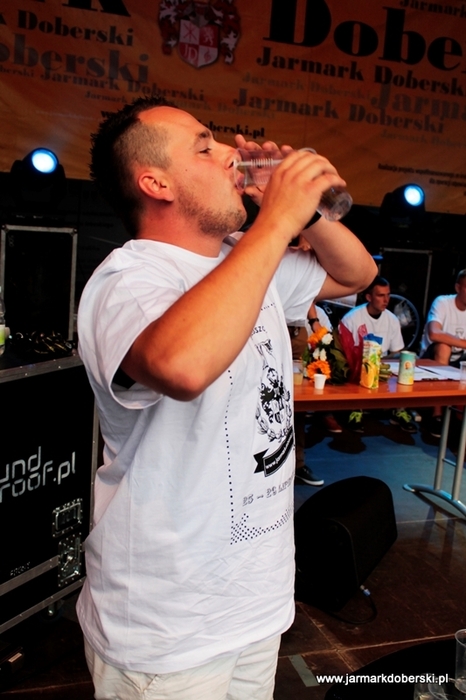 Jednak od początku… Konkurencję Mistrzostw Europy w Jedzeniu Kiełbasy Doberskiej reklamowaliśmy hasłem: Znacie kogoś, kto zjada przysłowiowego „konia z kopytami”, gdy jest głodny? Wszyscy zastanawiali się, czy w tym roku znajdzie się ktoś, kto pokona naszego niekwestionowanego mistrza Bogusława "WIELKIEGO" Tabora, który "łamie" swoją konkurencję jak patyki, odkąd tylko wystartował w naszych naszpikowanych nagrodami Mistrzostwach w Jedzeniu Kiełbasy Doberskiej? Publiczność, która zjawiła się pod sceną główną Jarmarku Doberskiego, gorąco dopingowała dziewięciu kontrkandydatów, którzy zostali wylosowani przez samego mistrza, spośród blisko trzydziestu osób zgłoszonych do konkursu.