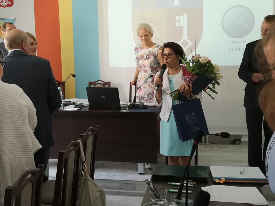 W dniu 27 czerwca 2019 r. w Starostwie Powiatowym w Łobzie podczas Sesji Rady Powiatu w Łobzie, Zarząd Powiatu w Łobzie, Radni Rady Powiatu oraz pracownicy Starostwa serdecznie podziękowali Pani Helenie Szulc za wspólne lata pracy na rzecz powiatu, Pani Helena Szulc pełniła funkcję Skarbnika Powiatu, dbała o kondycję finansową powiatu jak również wspierała wiele inicjatyw zarówno powiatowych jak i gminnych. Korzystając z okazji Renata Kulik Starosta Łobeski oraz Ryszard Sola Przewodniczący Rady Powiatu w Łobzie w imieniu wszystkich radnych oraz pracowników podziękowali za współpracę oraz wieloletnią działalność w powiecie.